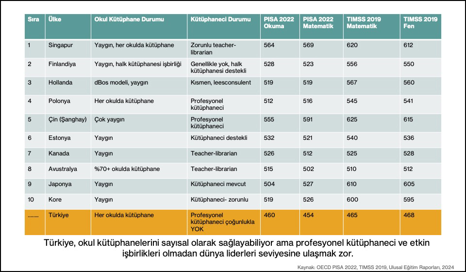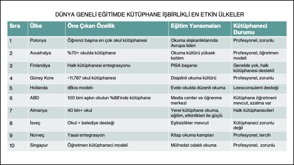 Dünya genelinde okuma kültürü gelişmiş, eğitimde başarıları yüksek ülkelerin ortak bir noktası var: güçlü kütüphane iş birlikleri. Polonya, her okulda kütüphane ve profesyonel kütüphaneci istihdamıyla Avrupa’nın okuma alışkanlıklarında lideri. Avustralya’da okulların %70’inden fazlasında öğretmen-kütüphaneci modeli uygulanıyor. Finlandiya’da okul kütüphaneleri halk kütüphaneleriyle entegre çalışıyor; PISA (Programme for International Student Assessment – Uluslararası Öğrenci Değerlendirme Programı) sonuçlarına baktığımızda, bu işbirliğinin eğitime doğrudan yansıdığını görüyoruz. Güney Kore’de 11 bini aşkın okul kütüphanesi var ve hepsi zorunlu profesyonel kütüphaneciyle çalışıyor. Bu da disiplinli bir okuma kültürü oluşturuyor. Almanya ve Hollanda’da ise halk kütüphanesi danışmanları okullara düzenli destek veriyor.